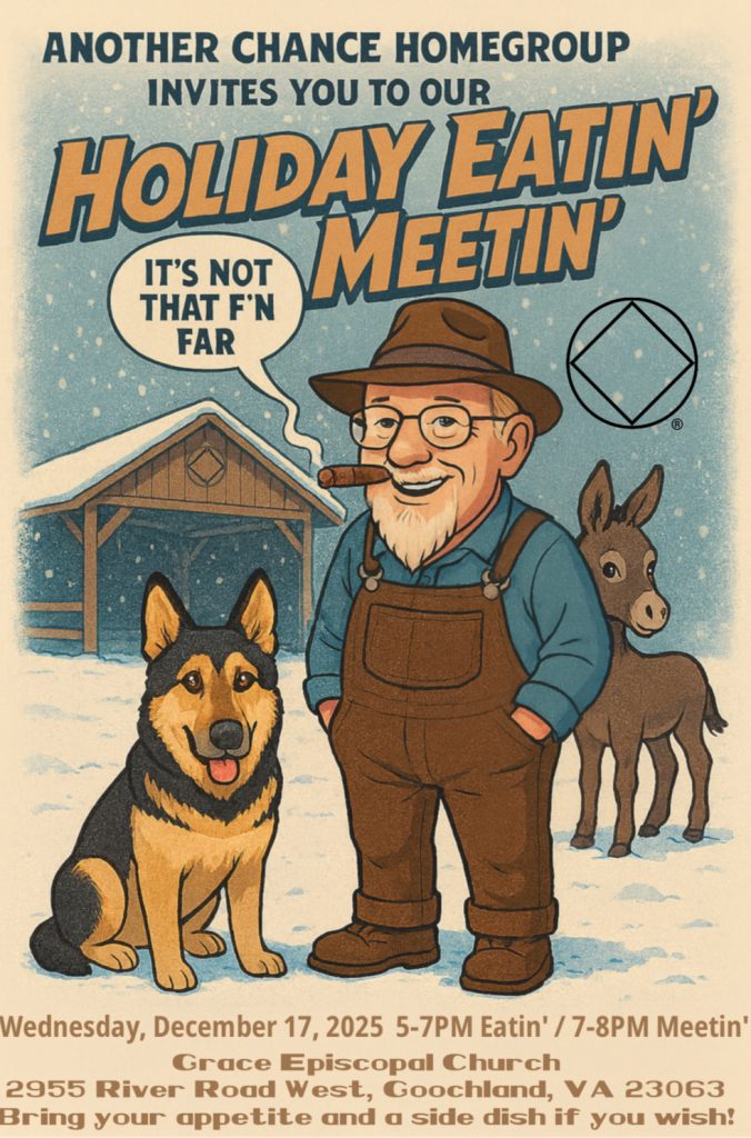 Hang out with the Another Chance homegroup on Wednesday, December 17, 2025 for their annual holiday Eatin’ Meetin’!