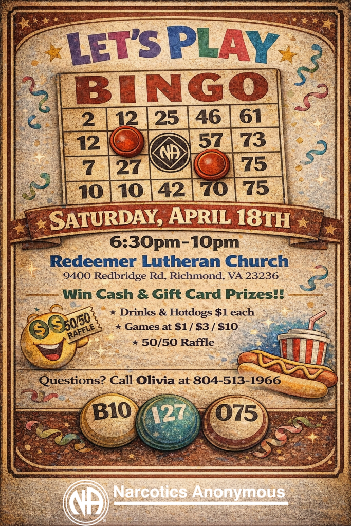 Bingo Night + Add to Google Calendar + iCal / Outlook export 00 days 00 hours 00 minutes 00 seconds Date Apr 18 2026 Time 6:30 pm - 10:00 pm Location Redeemer Lutheran Church 9400 Redbridge Rd, North Chesterfield, VA 23236 Share this event