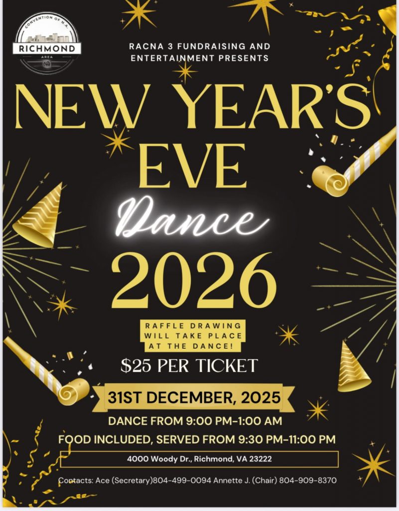 Wednesday, December 31, 2025 – 9:00 pm – 1:00 am at 4000 Woody Drive, Richmond, VA 23222. Food served 9:30 pm – 11:00 pm. Tickets $25. See flyer for additional information.