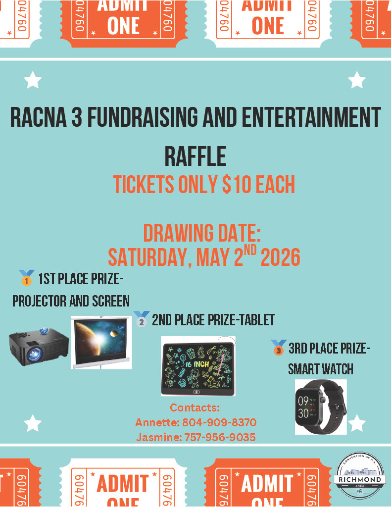 RACNA 3 Raffle – sponsored by Fundraising and Entertainment. Drawing Saturday, May 2, 2026. Tickets are $10.
