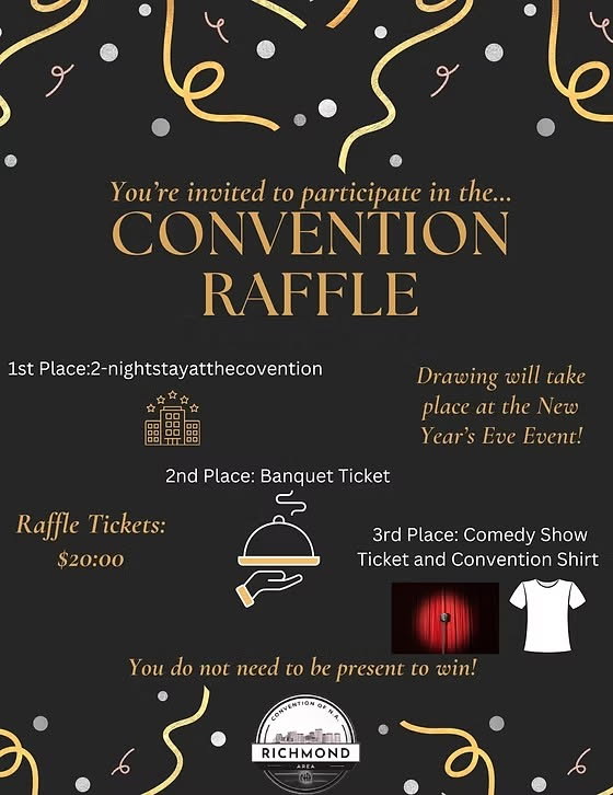 Raffle Tickets $20.00. Various Prizes – 1st Place – 2-night stay at the Convention. Drawing will take at the New Year’s Eve Event. You do not need to be present to win.